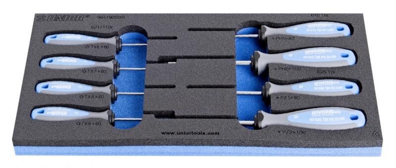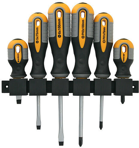 Csavarhúzó készlet professzionális fogantyúval. Készlet tartalma:Lapos csavarhúzó: 5 x 75, 6 x 100Lapos mini csavarhúzó: 6 x 38Phillips csavarhúzó: PH1 x 75, PH2 x 100Phillips mini csavarhúzó: PH2 x 38Muanyag csavarhúzó tartó