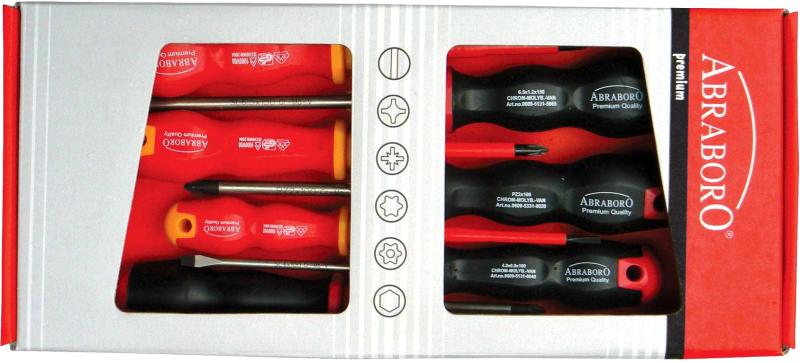 ABRABORO csavarhúzó készlet SL+PH+PZ/VDE SL+PH 7 részes T3 az iSzerszámnál. ABRABORO prémium minőségű 7 részes vegyes csavarhúzó készlet (T3) tartalma: Lapos csavarhúzók: 4,0x100mm 6,5x150mm Phillips csavarhúzó: PH2x100mm Pozidriv csavarhúzók: PZ1x80 PZ2x100 Szigetelt VDE lapos csavarhúzó: 3,0x100mm Szigetelt VDE Phillips csavarhúzó: PH1x80mm A markolat az alakjának kialak