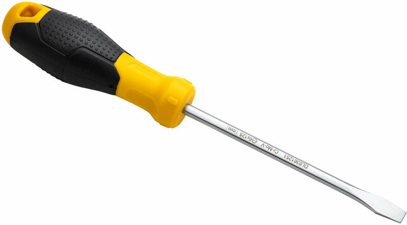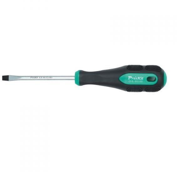 Lapos csavarhúzó ProsKit szár hossz:100mm fej szélesség:6mm nyél hossz:121mm Teljes hossz:221mm Megkeményített mágneses fej pontosan illeszkedik a csavarba. Magas minőségű króm-molibdén-vanádium ötvözet. Új tervezésű nyél, kényelmes jó fogást biztosít a megfelelő erőkifejtéshez. Csúszásgátló elasztikus műanyag. Származási hely: Taiwan