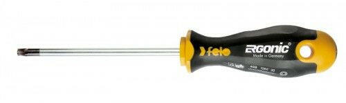 FELO csavarhúzó Torx csavarokhoz, ERGONIC markolattal. Az egyetlen markolat, melynek a belsejében lévő zselés cella alkalmazkodik a felhasználó tenyeréhez, a maximális nyomaték kifejtése mellett, egyedülállóan kényelmessé teszi a munkavégzést. Méretei: T27, penge hossza: 100 mm, penge átmérője: 5,0 mm teljes hosszban, markolat hossza: 106 mm, markolat legnagyobb átmérője: