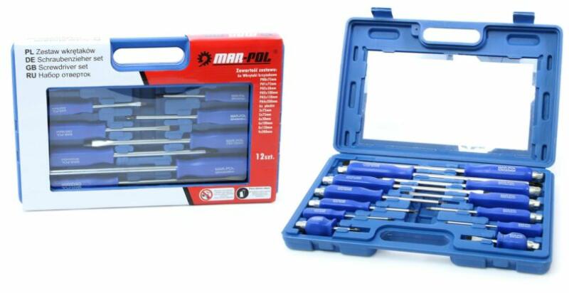 12db-os csavarhúzó készlet. A fogantyú áthalad a száron, hatszögletu végzodéssel, a fogantyú keresztmetszetével és a hatszögletu tengellyel. Mágneses. Anyag: CrV. Csavarhúzók: 3x75 mm 5x75 mm 6x38 mm 6x100 mm 8x150 mm 9x200 mm Phillips csavarhúzók: PH0x75 mm PH1x75 mm PH2x38 mm PH2x100 mm PH3x150 mm PH4x200 mm