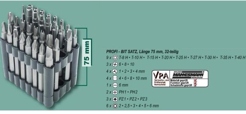 JELLEMZŐK: 10 ÉV GARANCIA TÜV/GS certifikációval 10 év garanciával: Német MANNESMANN professzionális 32 darabos hagyományos és speciális betétek a legújabb készülékek javításához is. Több eltérő szabvány szerinti fej 75mm így minden szokásos akkus stb. csavarhúzóhoz alkalmazható 9 x T-profile bits with hole, T-8 H/ T-10 H/ T-15 H/ T-20 H/ T-25 H/ T-27 H/ T-30 H/ T-35 H