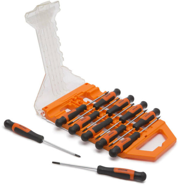 Lapos csavarhúzó: Sl3 x 75 mm, Sl4 x 100 mm, Sl5 x 75 mm, , Sl5 x 100 mm, Sl5 x 125 mm, Sl6 x 100 mm, Sl6 x 150 mm, Sl8 x 150 mmPhillips csavarhúzó: PH0 x 75 mm, PH0 x 100 mm, PH1 x 75 mm, , PH1 x 100 mm, PH1 x 150 mm, PH2 x 100 mm, PH2 x 150 mm, PH3 x 150 mmTorx csavarhúzó: T10 x 100 x 3 mm, T15 x 100 x 3.5 mm, , T20 x 100 x 4 mmPozidriv csavarhúzó: PZ0 x 100 mm, PZ1 x 100 mm, PZ2 x 100 m