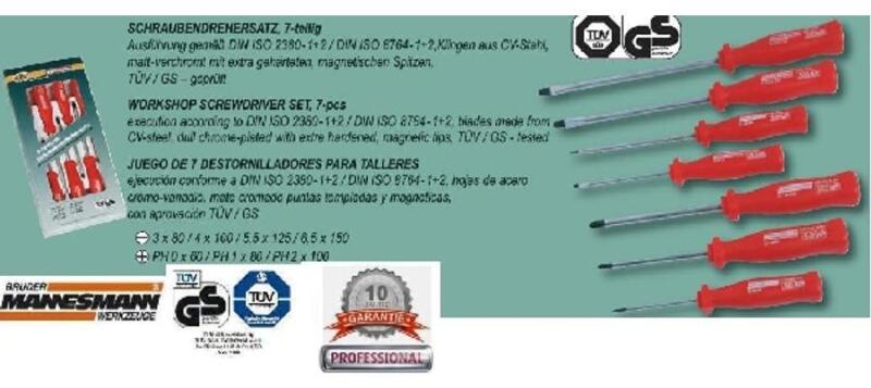 JELLEMZŐK: 10 ÉV GARANCIA TÜV/GS certifikated CV csavarhúzó klt. , mágneses; 4db lapos: 3 x 80 / 4 x 100 / 5,5 x 125 / 6,5 x 150 3db kereszt: PH 0 x 60 / PH 1 x 80 / PH 2 x 100 műa. dobozban Ausführung gemäß DIN ISO 2380-1+2 / DIN ISO 8764-1+2, Klingen aus CV-Stahl, matt-verchromt mit extra gehärteten, magnetischen Spitzen, TÜV / GS - geprüft