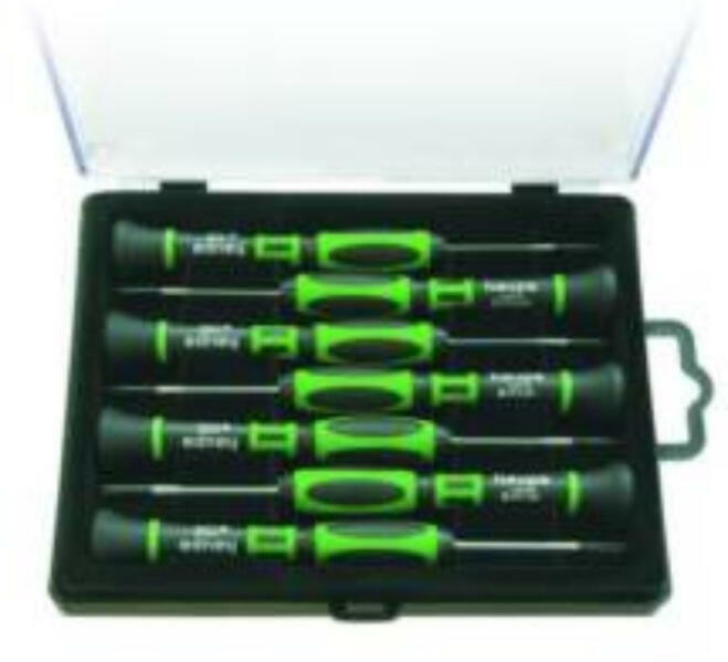 Chrom-Vanadium acél, krómozott pengék feketített csúccsal, fekete/zöld műanyag markolattal, 7 részes. Tartalma: 1-1 Elektronikai csavarhúzó 1,6 x 50, 2,0 x 50, 2,4 x 50, 3,0 x 50 és 1-1 Phillips Méret 1, 0 és 00 x 50