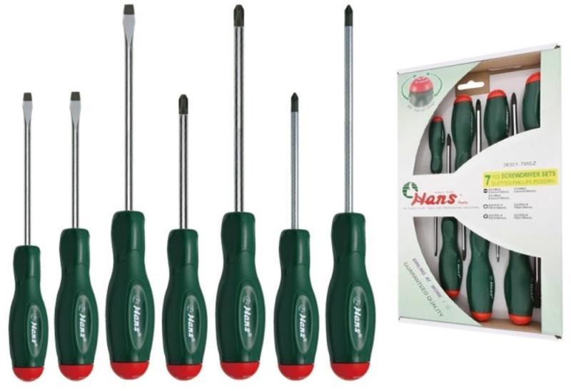 HANS csavarhúzó készlet 7 részes SL+PH+PZ 06301-7MGZ az iSzerszámnál. Professzionális, ipari minőségű (Industrial) HANS csavarhúzó készlet. A 7 részes készlet tartalma 1-1 db csavarhúzó: Lapos: SL4x100 mm; SL5.5x100 mm; SL6.5x150 mm, Phillips: PH1x100 mm; PH2x150 mm, Pozidriv: PZ1x100 mm; PZ2x150 mm, Anyaga Króm-vanádium. Ergonomikus kialakításának köszönhetően az egykompo