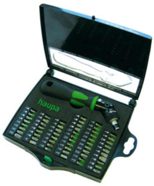 Haupa 104006 Csavarhúzó készlet "Flex" racsnis Racsnis csavarhúzó jobb-/ bal forgásiránnyal, 180°. -ban állítható szöggel és speciális betétkészlettel, csúcs minőségű S2 acélból! Így mindig keze ügyében van a megfelelő biztonsági- és speciális betét. Befogószár a betétek gyorskioldási lehetőségével és két komponensű markolattal, a csúszás- és elfáradásm