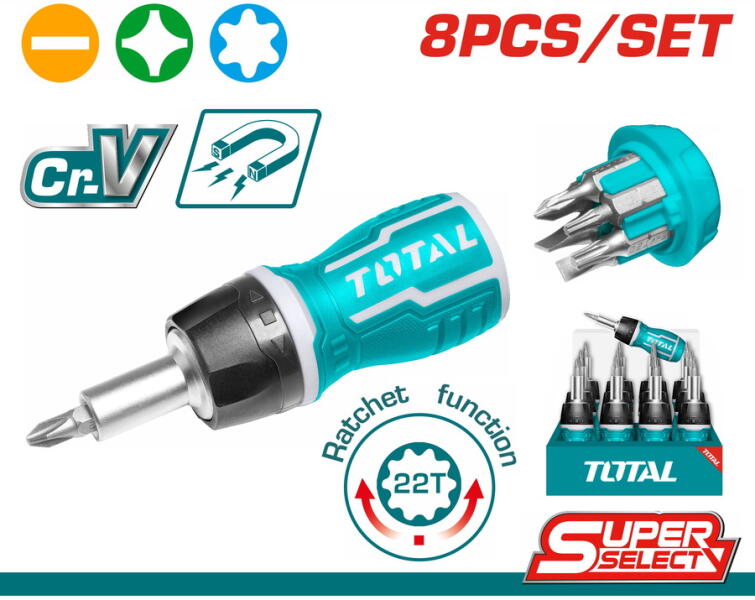 8 db marokcsavarhúzó készlet (TACSDS1726) A TOTÁL TACSDS1726 többcélú csavarhúzó készlet hatékony munkavégzést biztosít különböző típusú rögzítő elemekkel. Alkalmas háztartási, javítási, építőipari, összeszerelő, szétszerelő munkákhoz. Az eszköz moduláris szerkezetű - magában foglal egy magas minőségű fogantyút fogazott szerkezettel és hét cserélhető