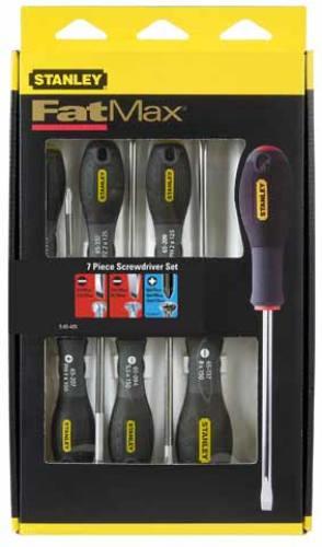 FatMax 7db-os csavarhózó készlet, tartó dobozban. (lapos, párhuzamos, Pz, Ph)A nyél és a penge között extra erős összekötés. A penge kíváló minőségű acélból készült. Kényelmes csúszásgátló fogantyú. A fogantyúvégek símák a gyors csavarás érdekében. A nagy méreteknél erősített kivitel. Lapos: 5,5 x 100; 8 x 150;Párh: 3 x 100; 3,5 x 75; Pz: 0x75; 1 x 100; 2 x