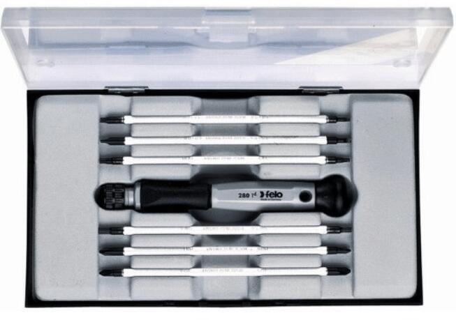 FELO műszerész csavarhúzó készlet, cserélhető pengékkel, kétkomponensű csúszásmentes markolattal. A markolat végén elhelyezkedő szabadon forgó sapkának köszönhetően a súrlódás minimálisra csökken. A markolatban található furat segítségével könnyen tárolható a szerszám és egy másik FELO csavarhúzó segítségével extra nyomaték érhető el. Tartalma: 2,0-3,5 ,
