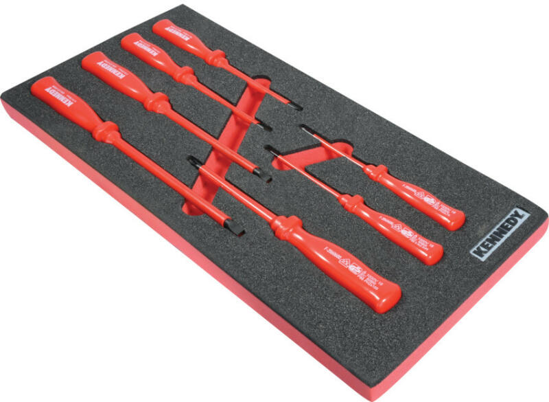 ‘Volt-tesztelt', hogy tökéletes biztonságot nyújtson elektromos berendezéseknél 1000V-ig váltóáram és 1500V-ig egyenáram esetén. DIN7438 és DIN EN 60900 szerint gyártva. Készlet összetétele: Kereszthornyú - 2.5 x 85, 4.0 x 100, 5.5 x 125, 6.5 x 150 mm. Párhuzamos él - No. 0 x 75, No. 1 x 100, No. 2 x 100 mm. Súly: 495 g Habszivacs betét mérete: 195 x 405 x 25 mmA következ