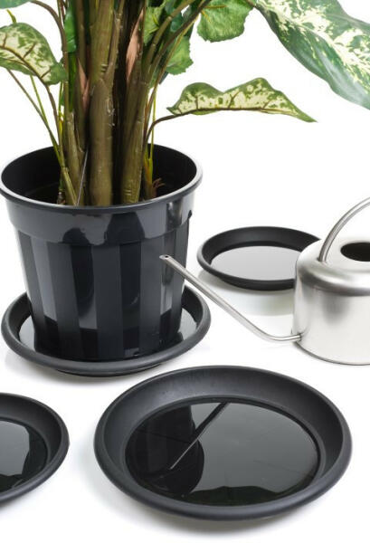 Fekete poliprolén alátét az egyszerű, tiszta öntözésért. Méretek: 2 cm magas és 20 cm átmérőjű.