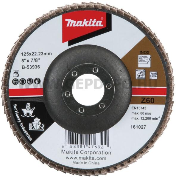 Makita lamellás csiszolótárcsa 125mm Z60 inox Léccsiszoló tárcsa nehézipari használatra. Használható durva élek lecsiszolására, hegesztési élek eltávolítására, sarkok lekerekítésére és rozsda eltávolítására. A cirkónium-oxid szemcse nagyon hatékony és tartós fém és rozsdamentes acél csiszolásakor, valamint alumínium, réz és hasonló fémek csiszolásához is h