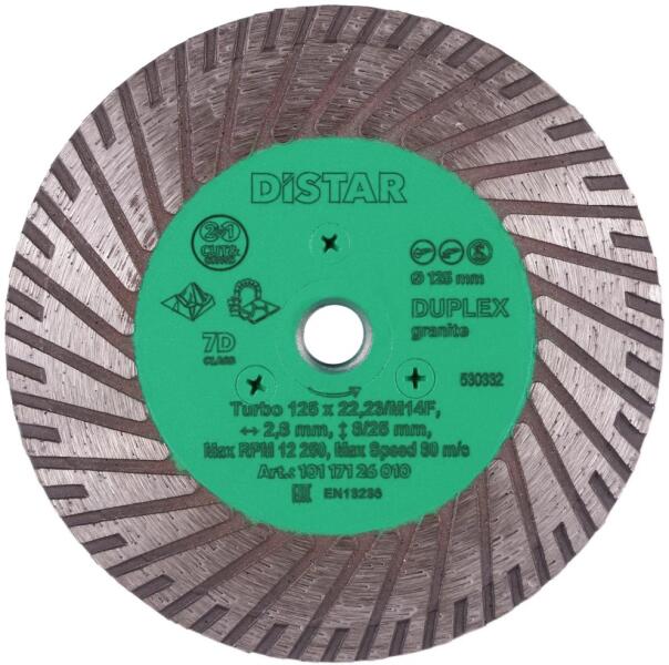 DISTAR gyémánttárcsa gránit- vagy márványlapok vágásához és csiszolásához. Átmérő: 125 mm; Középfurat: M14; Szegmensvastagság: 2,8 mm; Száraz vágás. Ref: 10117126010