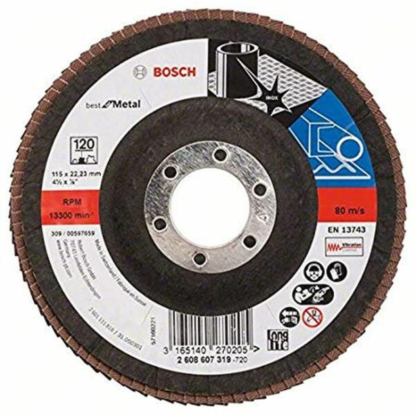 Műszaki adatok - Furatátmérő mm: 22,23 - Korongátmérő, mm: 115 - Szemcseméret: 120 Termékleírás - X571 fíber csiszolótárcsa, Best for Metal D= 115 mm; G= 120, hajlított