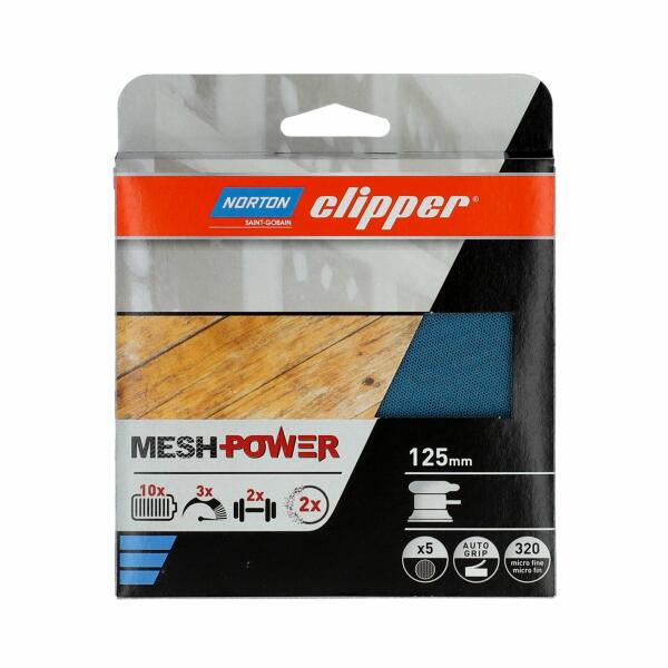 A MeshPower mátrix szerkezete ezer apró lyukat tartalmaz a por eltávolításához a test felületéről, lehetővé téve a friss levegő lélegzését a műhelyben. A MeshPower a szabadalmaztatott Norton No-Fil® technológián alapul, szárazon vagy nedvesen is felhasználhatók, és a nyitott szerkezetnek és a prémium szemcsés rendszernek köszönhetően tökéletes kivitelűek. Az öntap