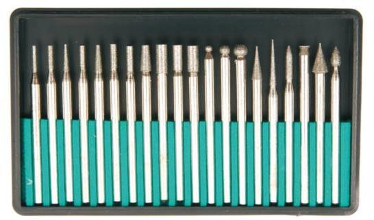 20 részes gyémánt bevonatú maró és csiszoló készlet szár átmérő 3 mm (BGS-1607) Minőségi gyémánt bevonatú készlet gravírozáshoz. Használható üveg, kerámia, acél és rozsdamentes acél megmunkálásához.