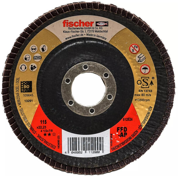 FISCHER FFD-AP 115 K80 INOX Lamellás csiszolókorong (512524) Terméki nformáció: A fischer FD-AP lamellás csiszolókorong egy nagyteljesítményű cirkónium korong acél és korrózióálló acél megmunkálásához. Az önélező cirkónium-alumínium-oxid csiszolószemcsék az optimalizált kötési mátrixszal kombinálva garantálják a nagy tartósságot és a nagy anyageltávolítási