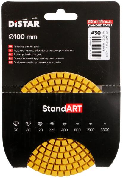DiStart StandArt Polír Tárcsa 30-as Formálja tökéletesre! Fedezze fel a simító és csiszoló lehetőségek új dimenzióját a DiStart StandArt Polír Tárcsa 30-assal! Ez a rugalmas gyémánt polírozó tárcsa az Ön megbízható társa lesz, amikor kerámia csempék és porcelán gres éleinek és lekerekítéseinek szakszerű megmunkálásáról van szó. Legyen szó akár lapos, akár