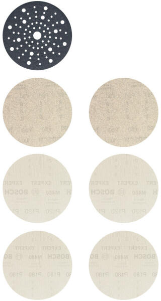 Közdarabok használata javasolt a megfelelő porcsökkentés és a hatékony fa-, festék- és gipszkartoncsiszolás érdekében Nagy hatékonyságú porelvezetés a Bosch Particle Control segítségével A por beszívása a nyitott hálóstruktúrán át történik Anyagok: festett fa, kemény fa Korongátmérő: 150 mm Szemcseméret: 2x80, 2x120, 2x180 Lyukasztás: nyitott hálós