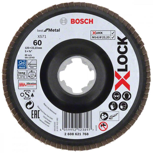 Részletek: Korongátmérő, mm: 125 Furatátmérő mm: 22,23 Szemcseméret: 120 X-LOCK Megfelelő a következőhöz: megmunkálható anyagok. Acél/vastartalmú fém Rozsdamentes acél/Inox Öntöttvas Acéllemez