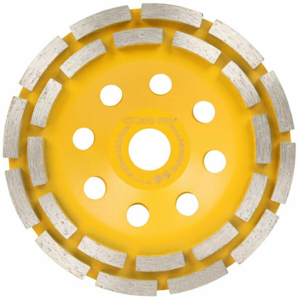 Termék leírása: Ez a kétsoros Strend Pro gyémánt csiszolókorong nedves és száraz megmunkáláshoz is alkalmas. Sarok- és padlócsiszoló gépekhez tervezték. Felhasználás: felü letek simítása csiszolása, régi ragasztó és szennyeződés eltávolítása különféle anyagokról, mint például: beton, természetes és műkövek, gránit, márvány, homokkő, mész-homok tégla,