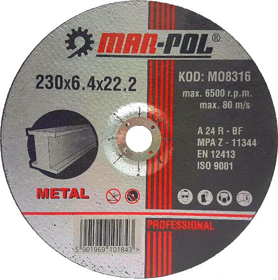 Csiszolókorong fémhez 230mm x 6,4mm x 22,2mmFém csiszolókorong sarokcsiszolóhoz kemény szénacél, lemezek és nemesfémek javításához. Technikai paraméterek:Korongátmérő: 230 mmVastagság: 6,4 mmLemezlyuk átmérő: 22,2 mm