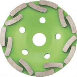 Gyémánt szegmens betoncsiszoló tárcsa. Dupla soros, sarokcsiszolókhoz készült. Beton, kő, márvány, gránit és tégla feldolgozására szolgál. A szerszám tiszta, sima felületet biztosít és kisebb felületek egyenletlenségeinek szintezésére is alkalmas. Szegmens magasság - 5 mm...