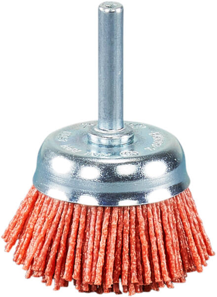 Nylon csészekefe lakkozott és lakkozatlan fa, fém és műanyag felületkezeléséhez. A durvább szemcséssége ideálissá teszi például az enyhe rozsda eltávolítására.
