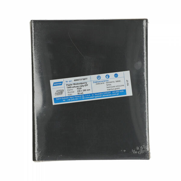 A Norton T44X vízálló csiszolópapír szilícium-karbid szemcsével. Nedvesen is használható. Festék- és lakkburkolatok, műanyagok, vas- és színesfémek csiszolására, polírozására szolgál. Termék információkGyártói cikkszám69957373877Méret230x280mmSpeci fikációP220 szemcseCsomagolási egység50 db/som.
