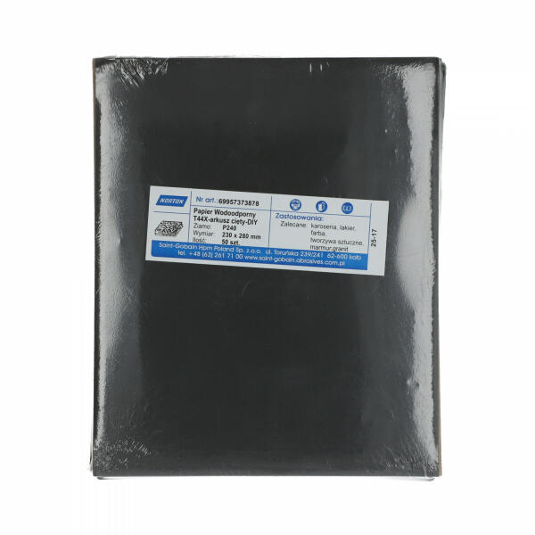 A Norton T44X vízálló csiszolópapír szilícium-karbid szemcsével. Nedvesen is használható. Festék- és lakkburkolatok, műanyagok, vas- és színesfémek csiszolására, polírozására szolgál. Termék információkGyártói cikkszám69957373878Méret230x280mmSpeci fikációP240 szemcseCsomagolási egység50 db/som.