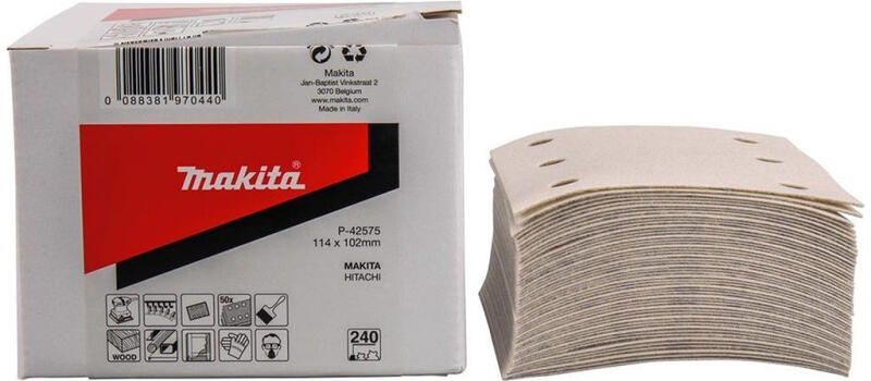 Alumínium-oxid csiszolópapír műgyantakötéssel, "E" papíron Ajánlott felhasználás: Fa, fém, falazat, rozsdamentes anyagok és műanyag csiszolására. BO4555 típusú géphez. Paraméterek: Anyag: Alumínium-oxid Kiszerelés: 50 db/csomag Méret: 114 x 102 mm Szemcseméret: K240 "E" hordozóanyag: 200 - 250 g/m2
