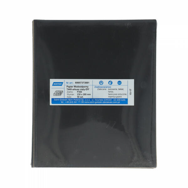 A Norton T44X vízálló csiszolópapír szilícium-karbid szemcsével. Nedvesen is használható. Festék- és lakkburkolatok, műanyagok, vas- és színesfémek csiszolására, polírozására szolgál. Termék információkGyártói cikkszám69957373881Méret230x280mmSpeci fikációP360 szemcseCsomagolási egység50 db/som.
