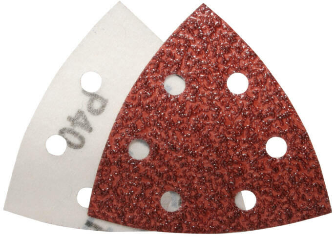 Alumínium-oxid szemcsék delta alakú, 6 porelvezető lyukkal ellátott, tépőzáras papír hordozórétegen Ajánlott szénacélok, kemény és puhafa, műanyagok csiszolására Stabil alap és fedőkötés műgyantából