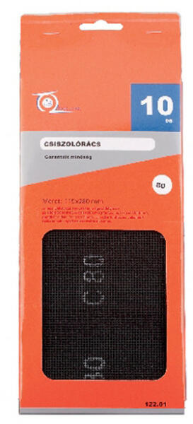 Csiszolórács 115x280 mm - P150 (10 darab) Szilícium-karbid szemcsék Fa, fém, festett felületekre vagy gipszkarton vagy vakolt felületek végső csiszolására Száraz vagy nedves csiszoláshoz (vízálló) Csiszolórács nagy rugalmassággal A hálós szerkezet megakadályozza az eltömődést Szilícium-karbid szemcsék és kemény szintetikus ásványi anyag alkotja a rácsot Mindkét old