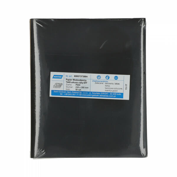 A Norton T44X vízálló csiszolópapír szilícium-karbid szemcsével. Nedvesen is használható. Festék- és lakkburkolatok, műanyagok, vas- és színesfémek csiszolására, polírozására szolgál. Termék információkGyártói cikkszám69957373884Méret230x280mmSpeci fikációP600 szemcseCsomagolási egység50 db/som.