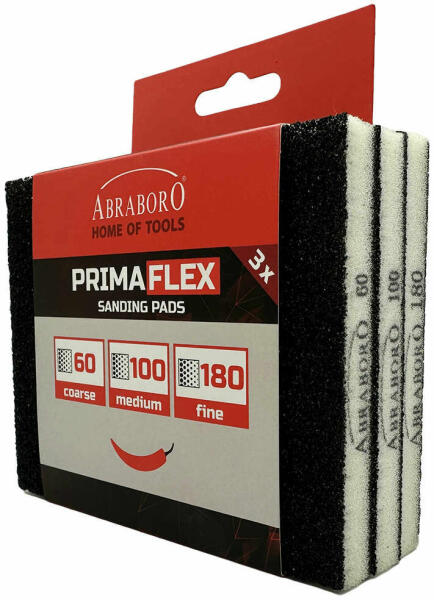 ABRABORO Csiszolószivacs készlet Alumínium-oxid szemcsék tömör műgyanta kötésben Nagy felületek csiszolására, festék eltávolítására, fa megmunkálására ideális 3 különböző szivacs - K60 | K100 | K180 A kép csupán illusztráció! Műszaki adatok Méret: 124 x 98 x12 mm Kiszerelés: 3 db/szett