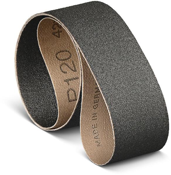 Textil csiszolószalagok. Szemcse típus: alumínium-oxid, félig nyitott. Műgyanta ragasztású speciális szöveten