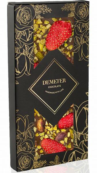 „A pisztácia kifogyott, csokoládé nem is volt!. Ránk egyáltalán nem illik ez a szállóigévé vált mondat, mert a selymesen krémes, prémium tejcsokoládénkat most a pisztácia sósságával, és az eper nyáriasan elbájoló varázsával kombináltuk, hogy a tejcsokoládét kedvelők se maradjanak ki az édes élvezetekből.