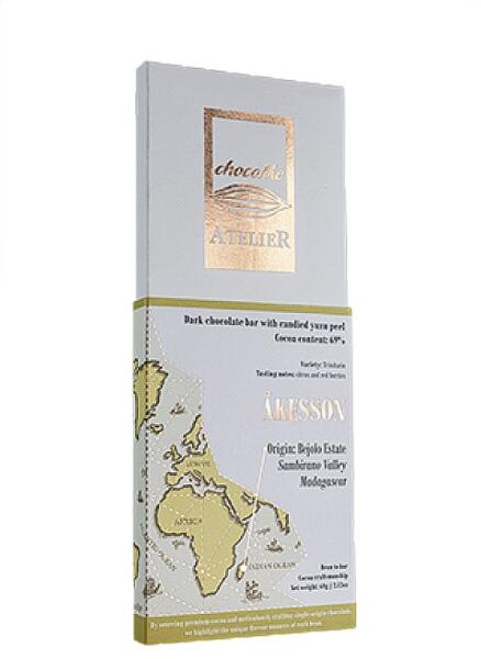 Étcsokoládé Åkesson kakaóbabból, kandírozott yuzu héjjal Åkesson Bejofo ültetvényéről származó élénk citrusus ízjegyeit hordozó csokoládéjánál nem is volt kérdés, hogy a citrusos ízeket szeretnénk kidomborítani, ezért egy nagyon különleges gyümölcsöt álmodtunk meg hozzá, így esett a választás a kandírozott yuzu héjra. A Yuzu Kelet‑Ázsiából, elsősorban