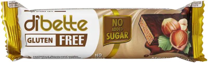 Dibette NAS mogyorós krémmel töltött gluténmentes ostya szelet kakaós étbevonó masszával 26g Hivatalos magyarországi forgalmazótól. Leírás: Mogyoró ízű krémmel töltött ostya szelet, kakaós étbevonó masszával mártva, hozzáadott cukor nélkül, édesítőszerekkel. Gluténmentes. Összetevők: Mogyoró ízű krém 42% (édesítőszerek: eritrit, szteviol-glikozidok (0,02%),