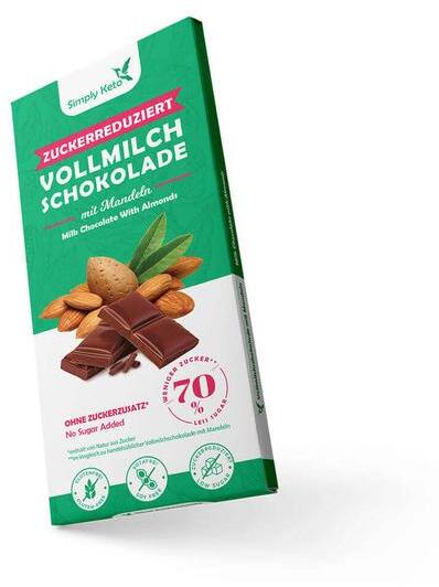 Hozzáadott cukormentes tejcsokoládé mandulával, eritrit-stevia keverékkel édesítve, legalább 40% kakaóval. A felszívódó szénhidráttól mentes, nulla kalóriás eritrit-stevia édesítőnek köszönhetően nem csak szénhidrátszegény, hanem kalóriaszegény is ez a tejcsokoládé, mely fogyasztható alacsonyabb szénhidráttartalmú diétában is. A Simply Keto tejcsokoládénk mand