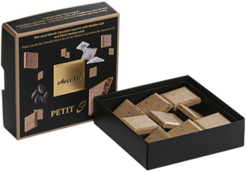 Falatnyi szőkecsokoládé lapocskák Maldon sóval és fekete szezámmaggal Egy olyan páratlan csokoládé összeállítás, melyben a frissen pörkölt fekete szezámmag és a Maldon só kettőse dominál, amit a méltán híres francia Valrhona csokoládé gyártó vállalat szőkecsokoládé alapanyagának karamell jellege egészít ki.