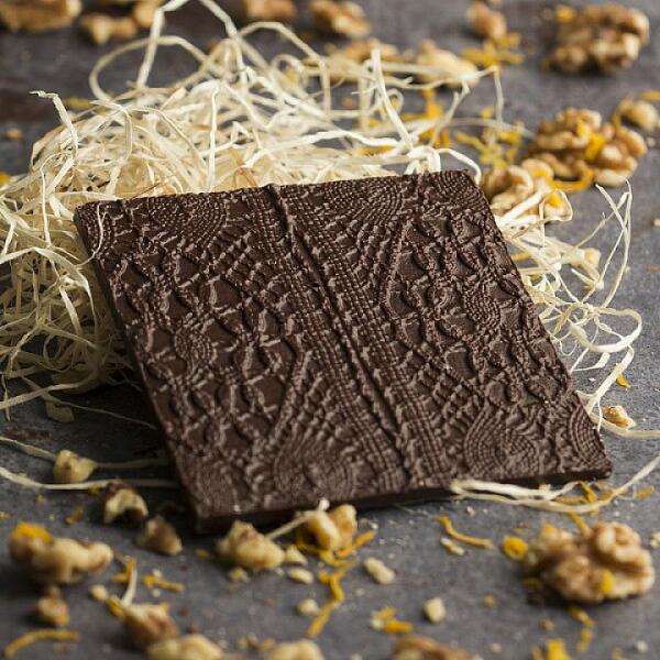 Madagaszkárról, a Sambirano völgyből származó gyümölcsös étcsokoládé narancsolajjal és dióval párosítva. Összetevők: kakaóbab cukor kakaóvaj napraforgó lecitin narancs kivonat dió