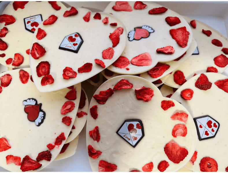 Liofilizált eperdarabokkal megszórt kézműves fehércsokoládé szív. A fehér csokoládé legalább 20% kakaóvajat és lagalább 14%tej szárazanyagot tartalmaz, a tejzsír legalább 3,5%. Összetevők: cukor, kakaóvaj, zsíros tejpor, laktóz ( tejből ) , sovány tejpor, emulgeálószer ( lecitinek ), természetes aroma, liofilizált eper. Nyomokban egyéb dió-féléket, szezámmagot, ta