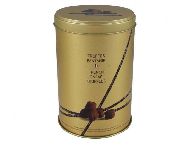Finom francia kakaós trüffel Marc de Champagne 3%-os pálinkával, aranyszínű, elegáns, matt kivitelű ónhengerbe csomagolva.