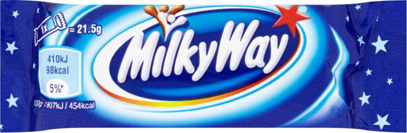Milky Way tejcsokoládéba mártott szelet tejes krém töltelékkel 21,5 g Hivatalos magyarországi forgalmazótól. Leírás: Tejcsokoládéba (39%) mártott szelet tejes krém (61%) töltelékkel. Összetevők: Cukor, Glükózszirup, Sovány tejpor, Kakaóvaj, Kakaómassza, Napraforgóolaj, Tejzsír, Pálmazsír, Árpamaláta kivonat, Laktóz, Savó permeátum (tejből), Emulgeálószer (szója