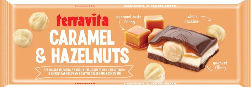 Terravita Caramel & Mogyoró 235g Tejcsokoládé a következőkkel: Joghurtos töltelék (33,9%) karamell ízű töltelékkel (10%) és egész mogyoróval (6,1%). Hozzávalók: Cukor, növényi zsírok (pálma, vajolaj). Kakaóvaj, szárított, zsírtalanított tejet . Szárított savó (nak, -nek tej), kakaó tömeg. Egész mogyoró 6,1%, tejes zsír. glükóz szirup, megvastagodott tej , cuk