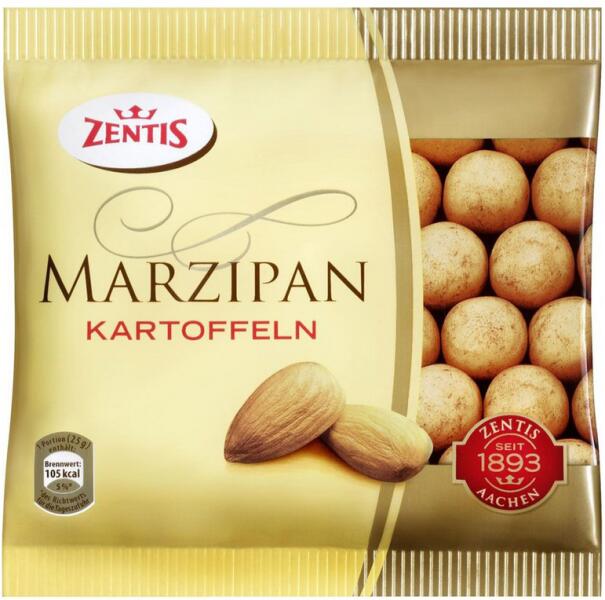Zentis Marcipánburgonya 100g Hivatalos magyarországi forgalmazótól. Leírás: Kakaóporral bevont marcipánburgonya. Összetevők: 67% cukor, 26% mandula, Invertcukorszirup, Glükóz szirup, Zsírszegény kakaópor, Nedvesítőszer (invertáz). Allergének: Más csonthéjasokat, tej alkotóelemeket és szóját is tartalmazhat. Tápértékre vonatkozó adatok: Átlagos tápértékek 100 g term