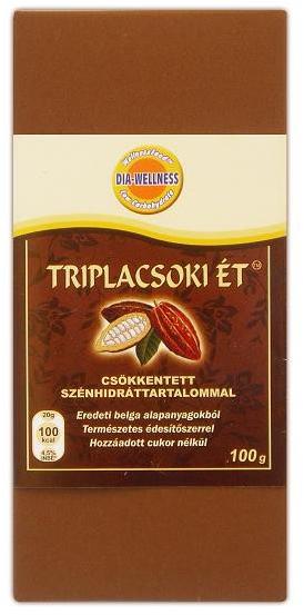 DIA-WELLNESS TRIPLACSOKI ÉT Dia-Wellness Triplacsoki étcsokoládé eredeti belga alapanyagokból, 30%-kal csökkentett szénhidráttartalommal, természetes édesítőszerrel. A termék hozzáadott cukrot nem tartalmaz, 55% kakaó-szárazanyag tartalommal rendelkezik, használható sütéshez, főzéshez is. Cukorbetegek és fogyókúrázók is fogyaszthatják. Összetevők: kakaómassza, kakaó